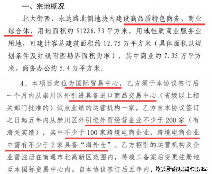 从地块出让开始,它就刻画着市北未来南通站前商务区“门户级商业枢纽”的模样:“高品质特色商务、商业综合体”“国际贸易中心”“引进外贸经营企业不少于200家”“不少于100家跨境电商企业”……
