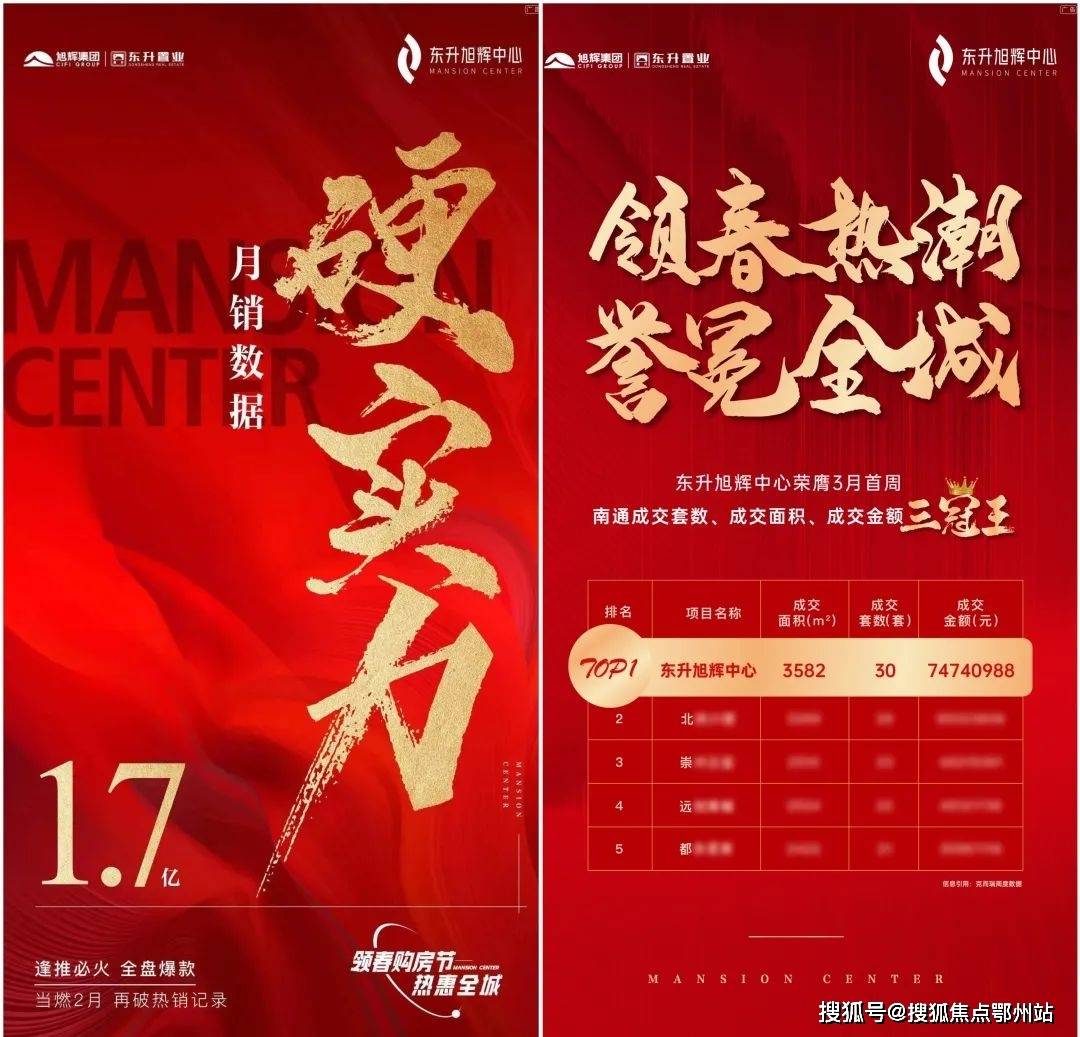 克而瑞数据显示,3月首周,东升旭辉中心获得南通成交套数、成交面积、成交金额三冠王。