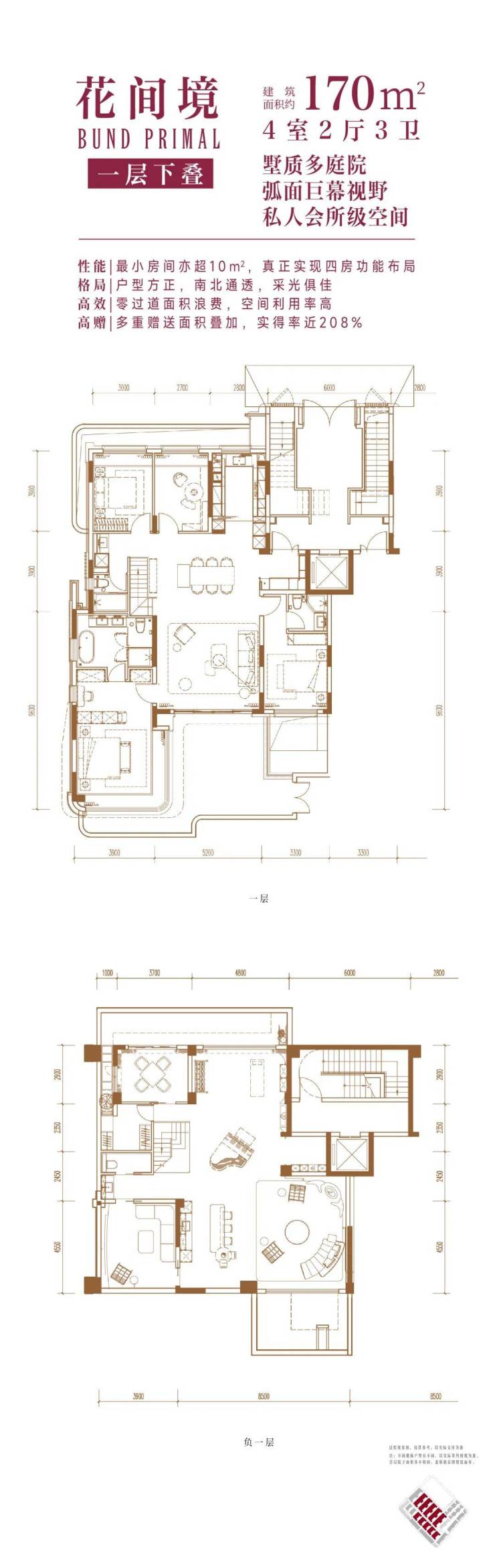 从户型设计来看,一楼户型附赠超大地下室及双层庭院;二楼户型附赠星空露台;三楼附赠露台及其他空间;户型实得率最大可以超过200%!平均也能达到约150%左右!