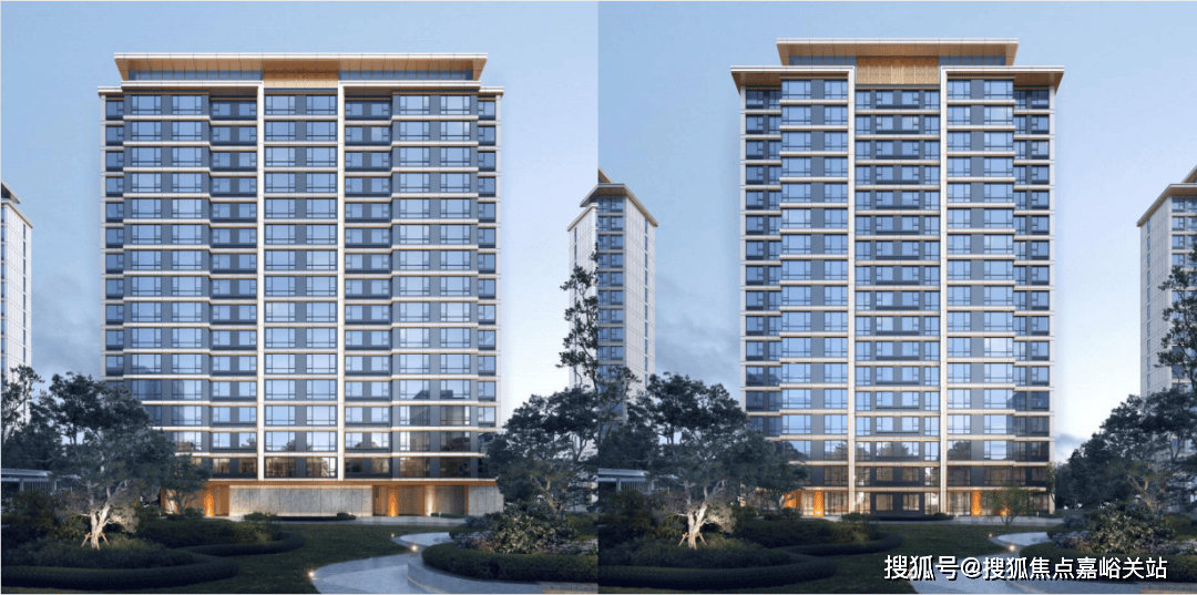 现代风格:立面利用大面积玻璃+阳台落地窗+金属型材+层间装饰提升建筑整体感和精致度,外立面大面采用浅色仿石多彩漆,浅灰色金属格栅,浅灰色玻璃,香槟色金属型材收边形成创造出建筑独有的人与自然、动静结合、丰富美观的轻盈质感,彰显住宅品质