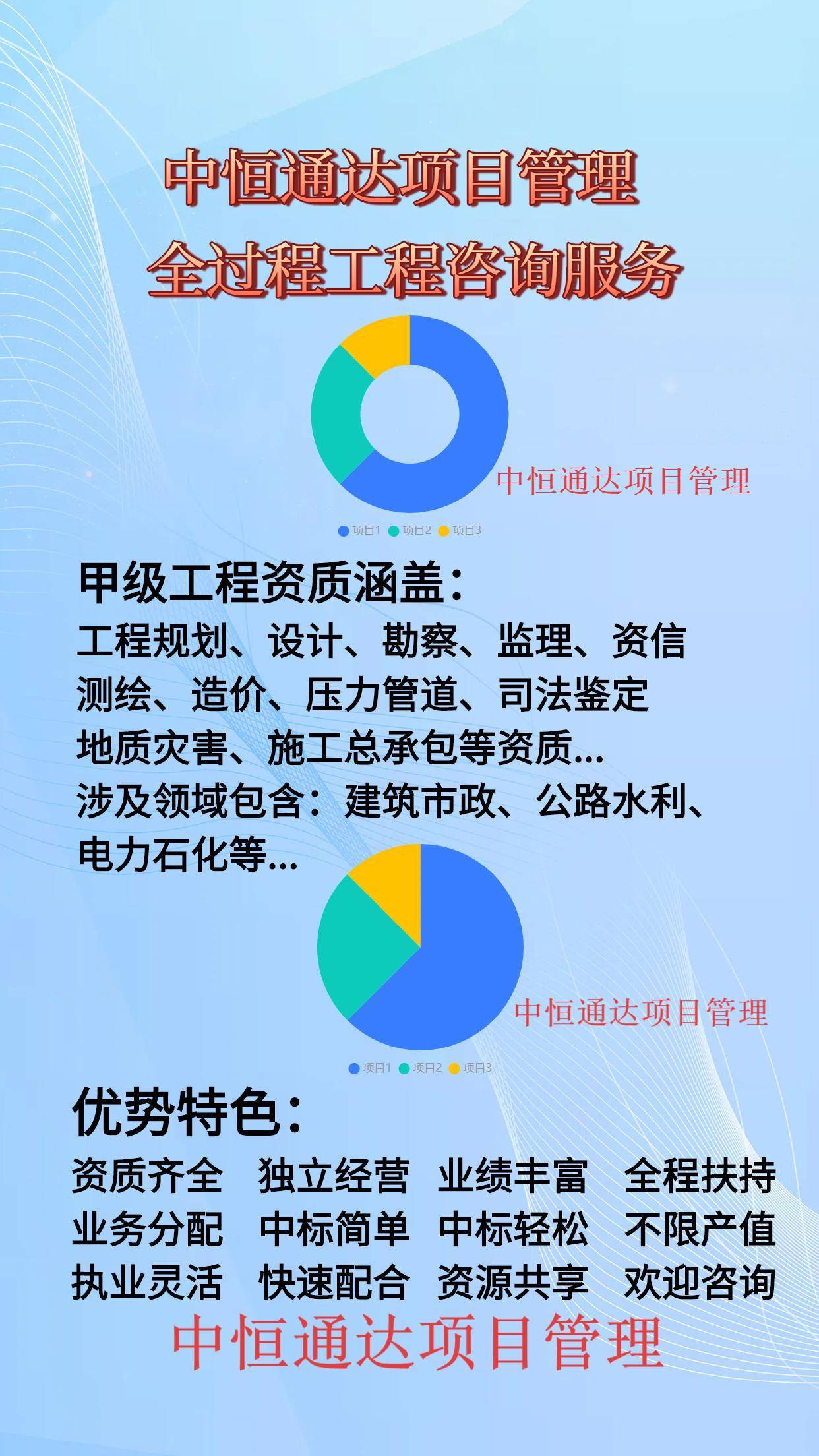 :公司甲级资质涵盖工程规划、工程设计、工程勘察测量、工程监理、工程造价、工程咨询资信、工程测绘、压力管道、工程施工总承包资质等全过程工程咨询资质。