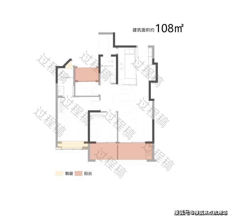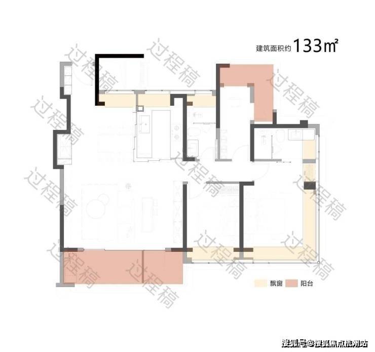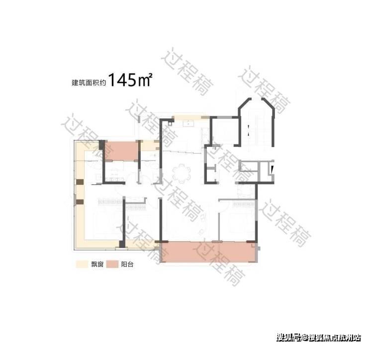 户型配备大面积飘窗(浅米域)和阳台(浅粉域),飘窗可引入柔和的自然光线,提升卧室等空间的明亮度;阳台则进一步拓展了采光面,同时有利于空气流通,保障室内通风效果,让空间更显通透舒适。
