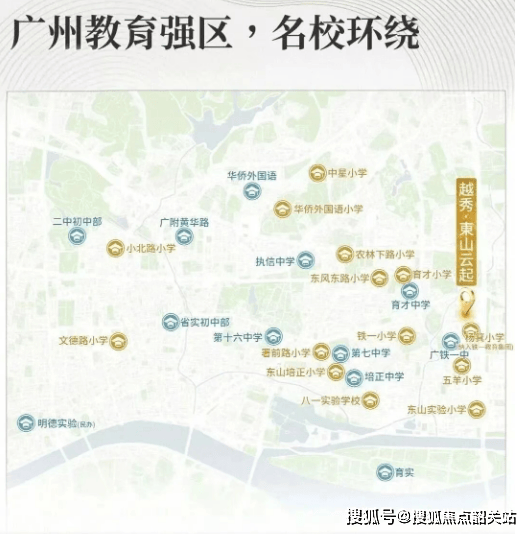 教育资源是越秀·東山云起的核心亮点之一,项目周边汇聚了从小学到初中的优质教育资源,实现12年教育无忧,满足家庭子女的教育需求。小学方面,项目对口杨箕小学,该学校已正式纳入铁一教育集团管理,铁一教育集团作为广州知名教育集团,师资力量雄厚、教学质量优良,能够为孩子提供优质的小学教育;初中方面,根据越秀区最新的小升初分组表,项目对口的初中堪称“豪华阵容”,包括广州7中、13中、16中、培正中学、省实中学、铁一中学等多所广州重点中学,这些学校办学历史悠久、教学成果显著,能够为孩子的初中教育提供坚实保障。距离方面,杨箕小学距项目步行约800米,步行时间约10分钟;对口初中距离项目均在3公里范围内,驾车约10分钟可达,步行或骑行均可轻松抵达,让孩子上学更便捷,家长更省心。