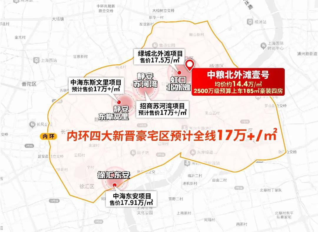 内环四大新晋豪宅区,新房售价预计全线万/㎡!其中徐汇东安最新价格17.91万/㎡,东斯文里和苏河湾网传价格都在17-18万/㎡左右,北外滩最新价格也已揭晓——17.5万/㎡。