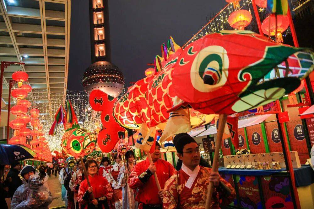 而“浦东中国年味节”活动现场,则汇聚了“沪上年味”“各省年礼”等150余个品牌,近30位B站UP主带来美食、手作、绘画等多样化体验。“鱼灯巡游”等十大主题活动,浦江边打铁花等15场非遗展演,国潮戏剧等15场传统与现代交融的沉浸式演出,以中国红为主色调的八骏迎福灯等艺术打卡装置,用当代语汇诠释传统年俗。