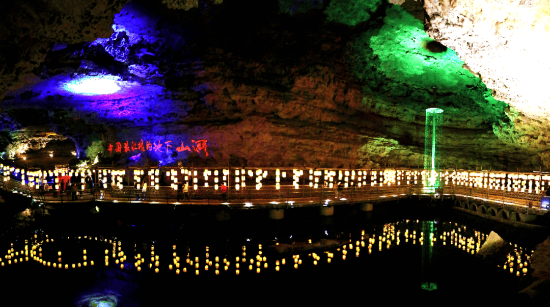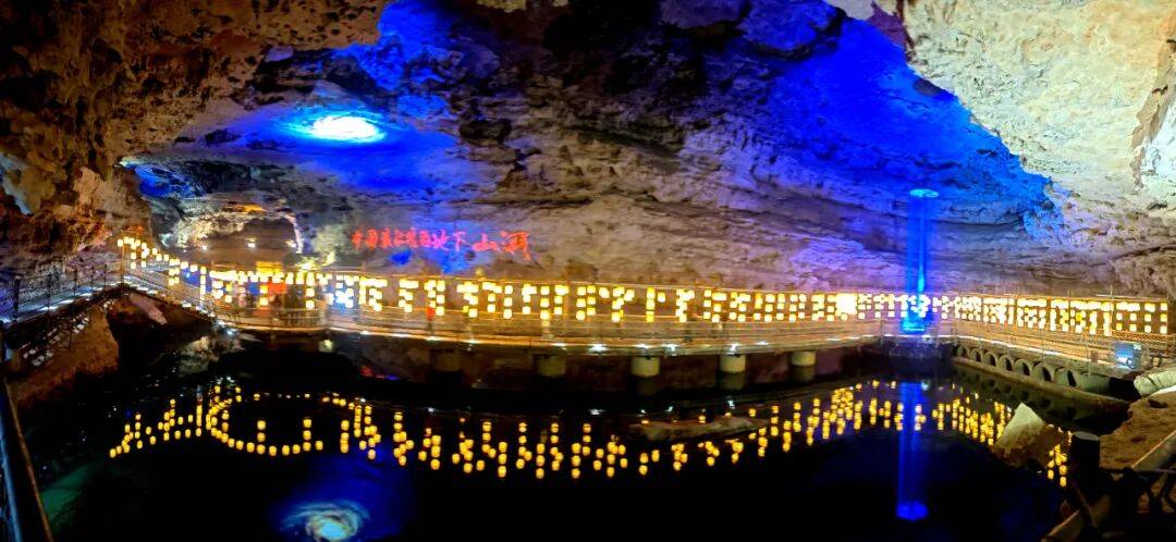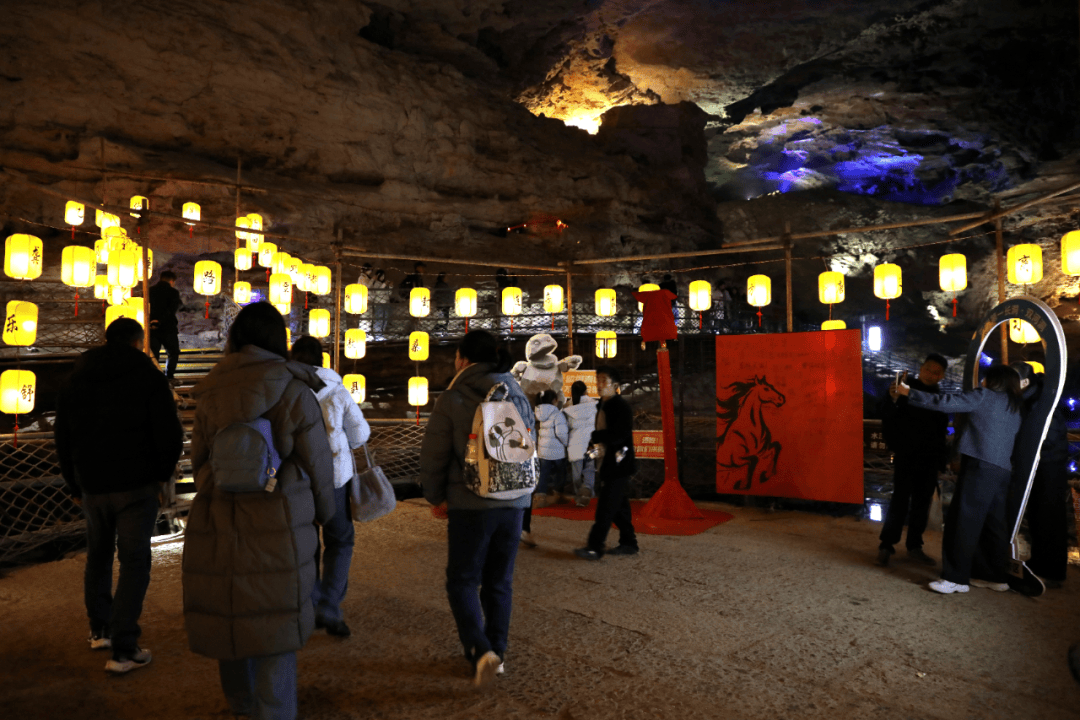 溶洞内,寓意吉祥的百家姓灯笼随风轻摇,游客穿梭于钟乳石之间,欢声笑语在洞中回荡,仿佛一场地心深处的新年狂欢。