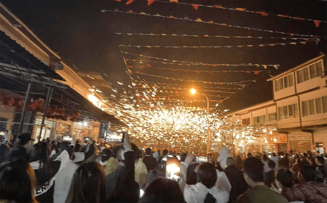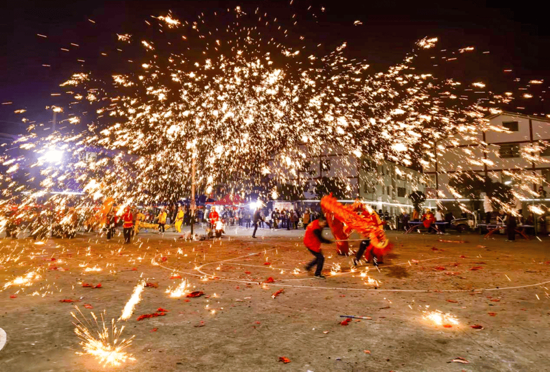 夜幕降临,龙灯表演精彩上场,金龙随着鼓点翻腾起舞,璀璨烟花与绚丽铁水火花相映成辉,点亮了洪关的夜空。随后,龙灯队伍沿街巡游祈福,所到之处,村民驻足观看、拍手称赞,纷纷用手机记录这喜庆时刻。