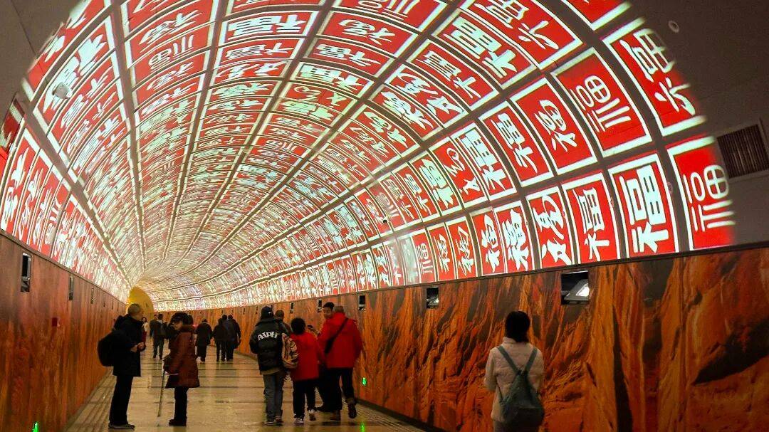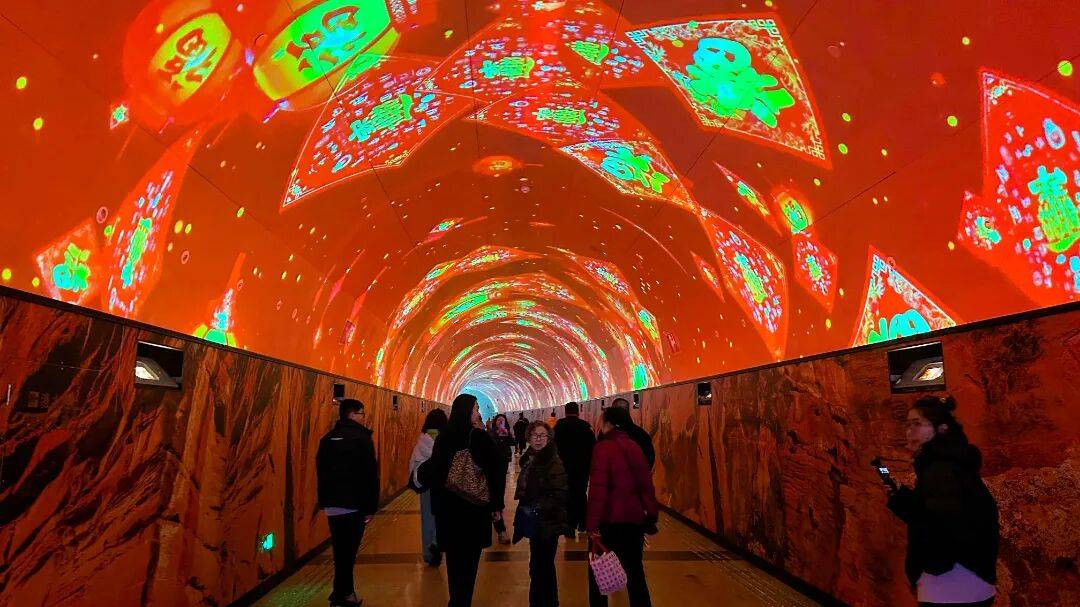 大瀑布赤水丹霞2亿年穿越地心隧道全面升级,32台投影机与16台音响构建全方位感官系统,依托hirender软件实现声光电精准联动。春节期间,隧道顶面呈现百福、烟花等全景影像,搭配电梯专属立体音效,让游客在行进中获得“穿越地心”的沉浸式观影体验,新春氛围拉满。