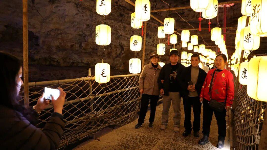 “地心过大年,酷玩不打烊”。双河洞景区张灯结彩,红灯笼高悬,喜气洋洋。网红打卡点前,游客们自觉排队,用镜头定格新年美好瞬间。
