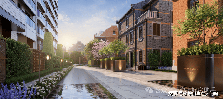 同时,建筑师还利用车行主入口的空间,结合水景、景墙和绿化打造出别具风格的开放式景观节点,并在风貌保护区的巷弄内设置端头对景,宅间花园等。